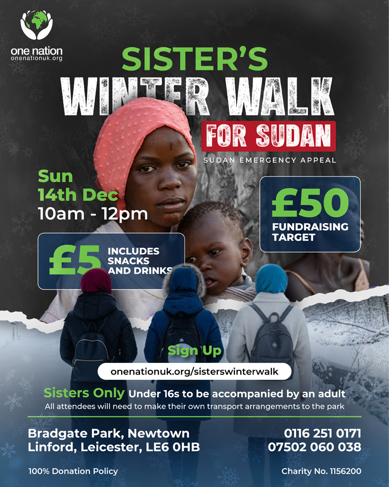 Sisters of Leicester will be doing a Winter Walk, approximately 5km, to raise funds for One Nation’s Sudan Emergency Appeal.
