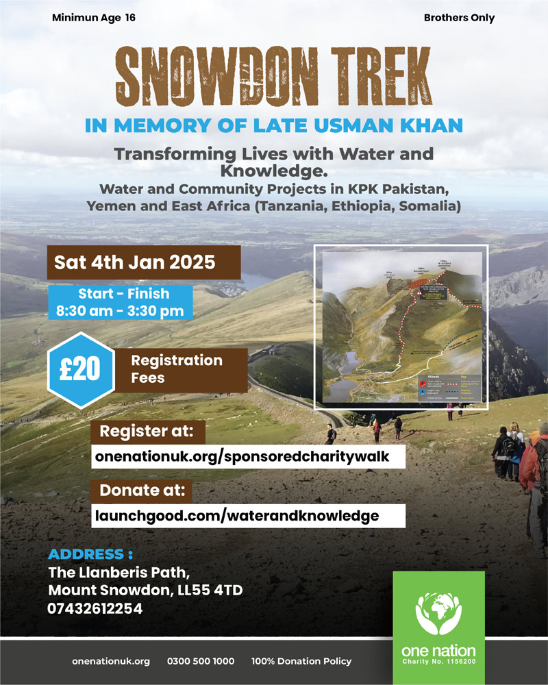 Join us on Saturday, 4th January, for a Charity Walk in Mount Snowdon, to raise funds and awareness for life-changing water and community projects in KPK, Pakistan, Yemen and East Africa (Tanzania, Ethiopia, Somalia) as we continue Usman Khans legacy. Your support will help build sustainable water distribution systems and eco-friendly Masajid and Madrasahs, empowering communities to thrive.